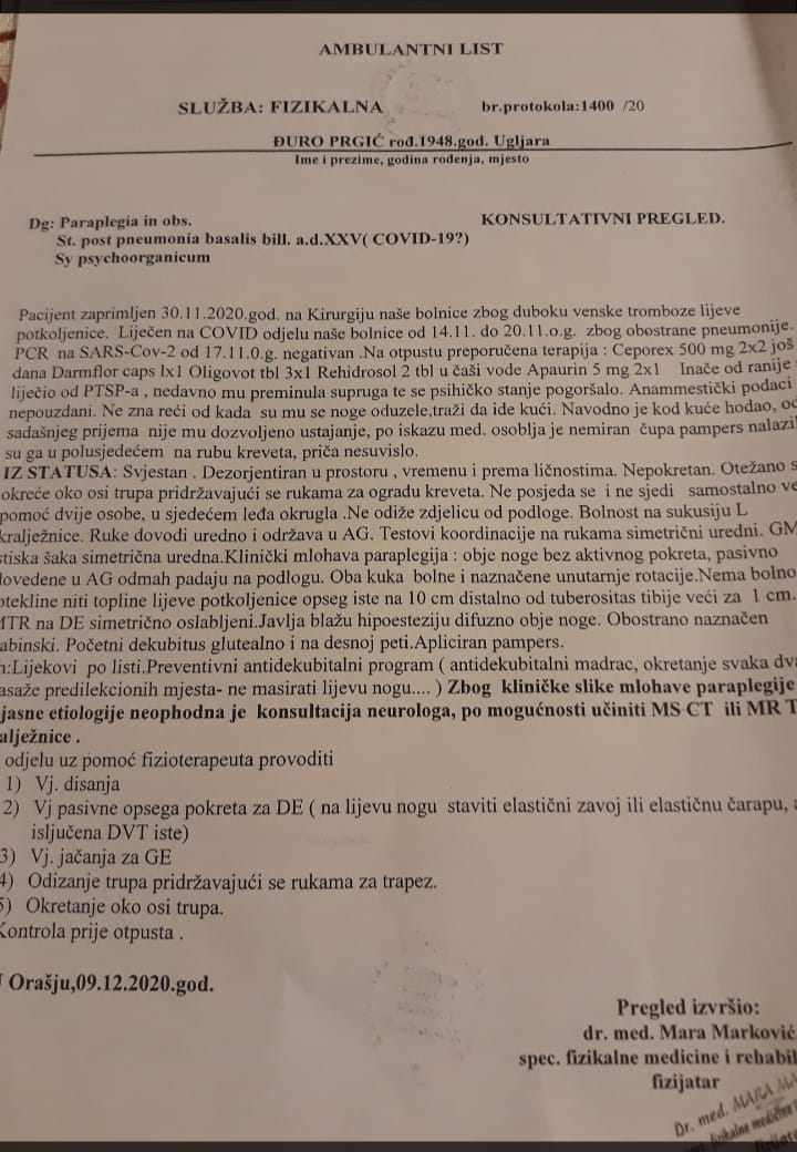 Slijedeći dokument je datuma 09.12.2020 godine kada je obavljen pregled pacijenta. U dokumentu jasno stoji da je pacijent ranije liječen u bolnici na COVID 19 odjelu, ( 14.11 – 20.11 ), zbog obostrane upale pluća te da je test na COVID 19 negativan. Dakle potvrđuje se ono iz prvog otpusnog pisma.