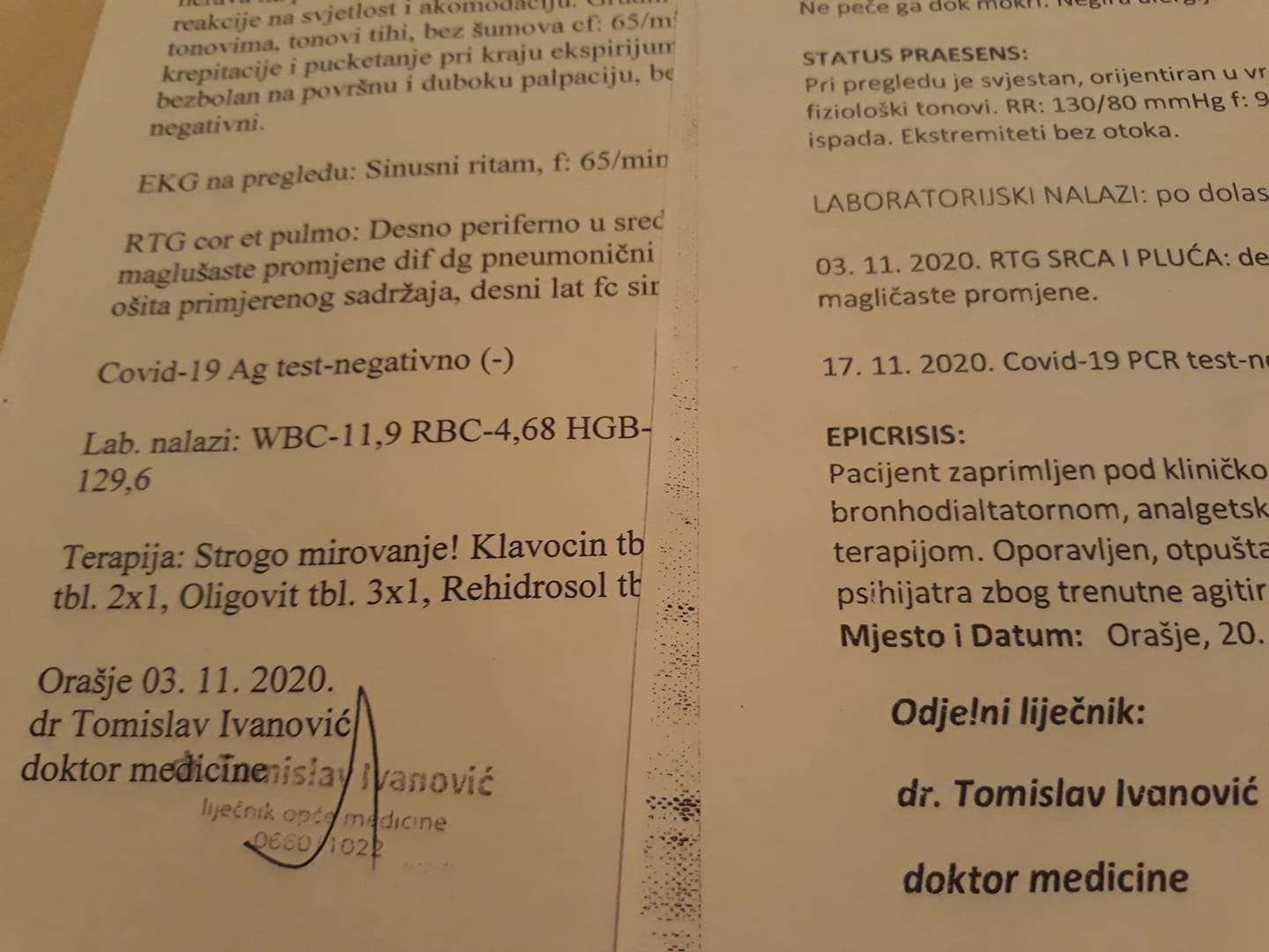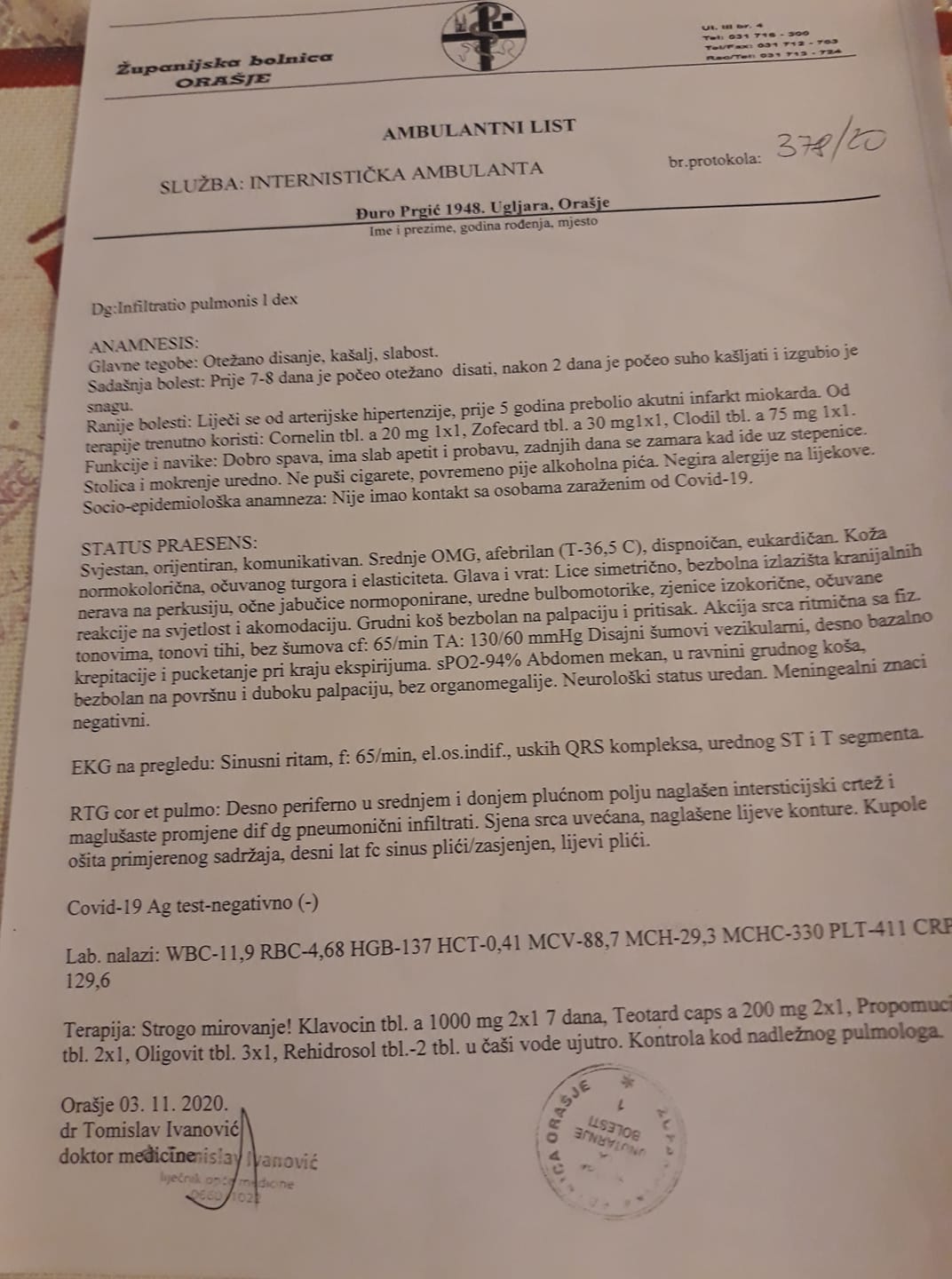 Prema prvom dokumentu pacijent je odvezen u bolnicu 03.11 sa simptomima otežanog disanja, kašlja i opće slabost. Iz dokumenta se vidi da je pacijent tada bio pokretan, pošto je navedeno da se zamara prilikom uspinjanja uz stepenice. Pacijent je poslan na kućno liječenje,a prvi COVID test je negativan.