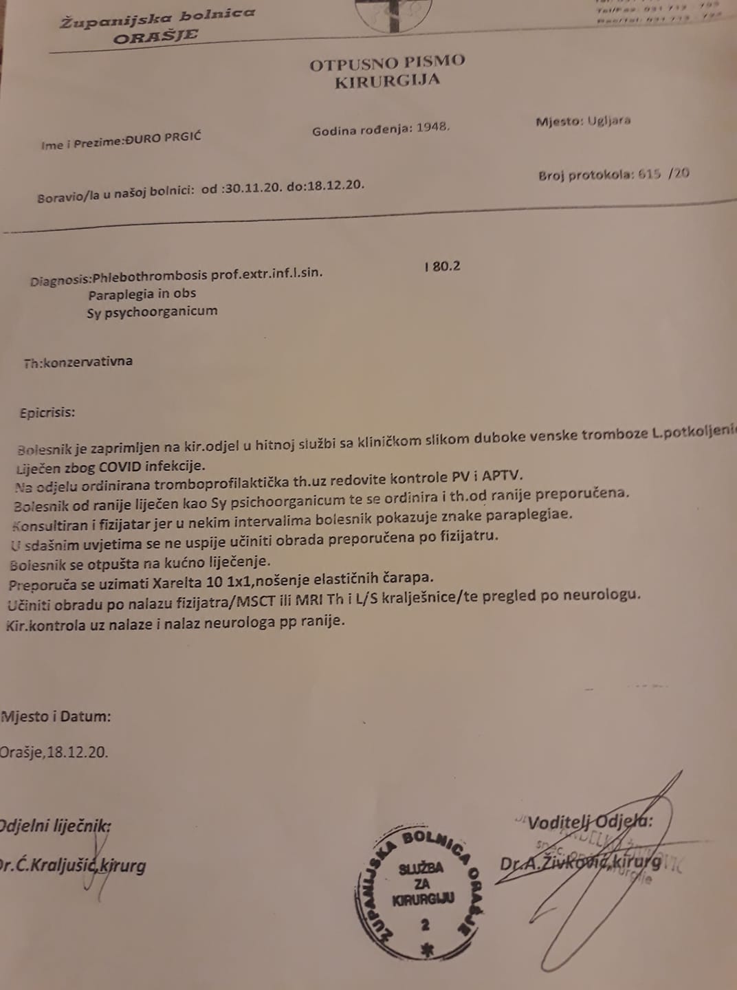 Zadnji dokument je otpusno pismo od 18.12.2020 godine. Ovdje se samo navodi da je pacijent pušten kući i da je liječen od infekcije COVID 19, dekubitius se ni ne navodi.