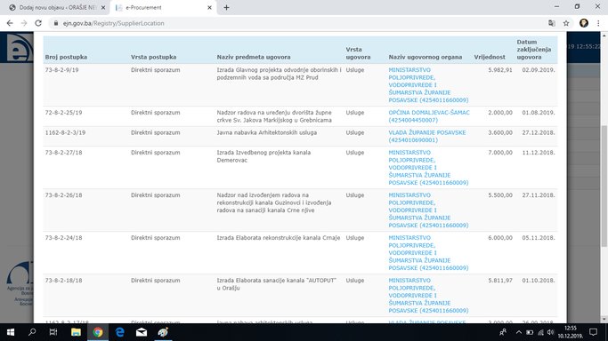 Pred sam kraj mandata sklopljena su četiri takva ugovora u vrijednost od približno 25 tisuća maraka. Ugovori su sklopljeni dana 01.10.2018, 5.11.2018, 27.11.2018 i 11.12. 2018 godine. Ugovori se odnose na izradu elaborata i nadzor nad radovima na kanalima Demerovac, Crne njive i Crnave.